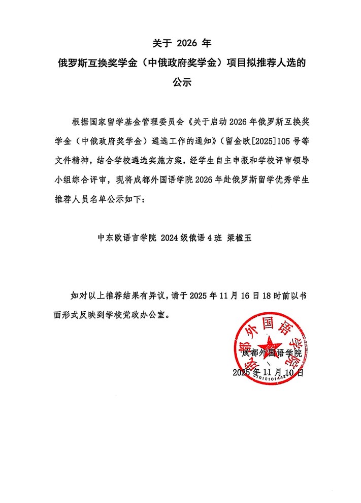 关于 2026 年 俄罗斯互换奖学金(中俄政府奖学金)项目拟推荐人选的公示