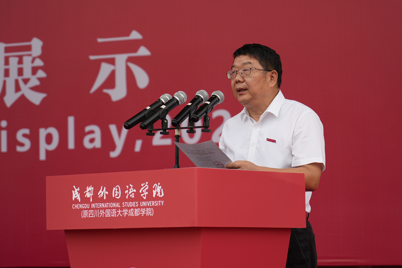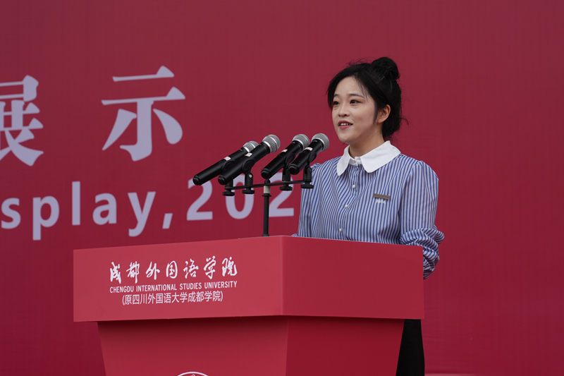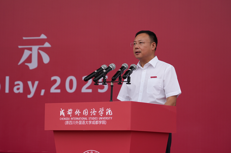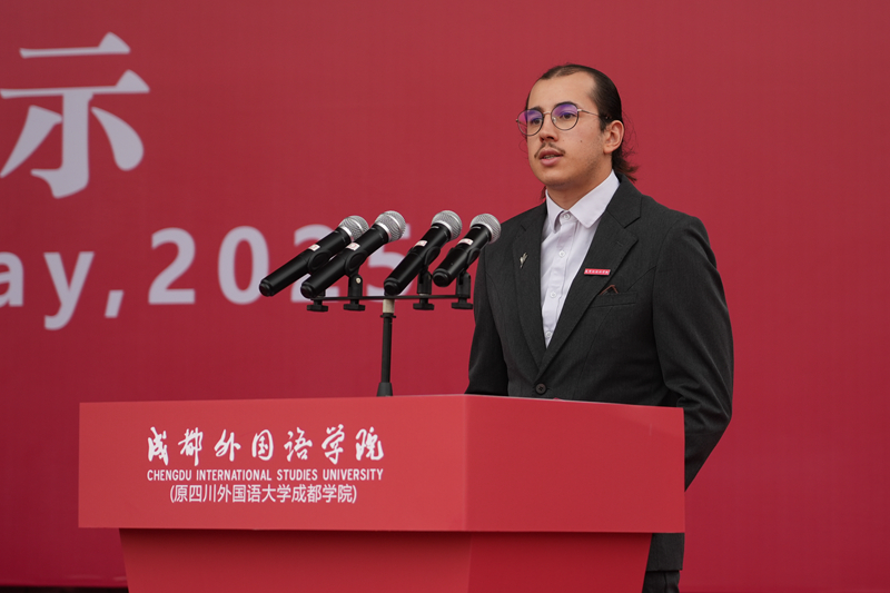 英语语言文化与翻译学院卢璐副教授代表教师发言,她勉励同学们以“深耕”为基、以“实践”为径、以“坚韧”为盾,知行合一、学以致用,在成都外国语学院领略语言世界的万千气象,找到属于自己的那一束光。西欧语言学院法语专业外籍教师马索(PERRISSIN-FABERT MARCEAU)讲述了他在校园里感受到的蓬勃学术氛围和师生间温暖的互动,鼓励同学们探索专业、认识自我、结交挚友、不惧挑战,满怀憧憬开始新征程。