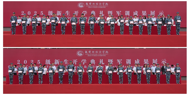 开学典礼结束后,军训表彰和成果展示随即举行。高晋康书记宣读《成都外国语学院关于表彰2025级新生军训优秀内务寝室、优秀学员及优秀教官的决定》,希望同学们珍惜荣誉、接续奋斗,在大学中挥洒出彩青春。受到表彰的代表迈着整齐步伐自信走上主席台,学校领导、老师为他们颁发荣誉证书。