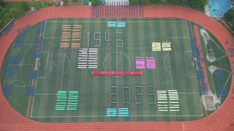 今年是中国人民抗日战争暨世界反法西斯战争胜利80周年,军训成果展示特意编排了《彩旗飘扬》和《向祖国致敬》两个团体操节目:在翻涌的彩带间,同学们摆出“80”“1945”“2025”等字样;在同心圆造型中,鲜红的党旗、国旗徐徐展开,振奋人心。伴随着激昂旋律,全体新生同上一堂思政大课,弘扬伟大抗战精神,自信自强开创未来。