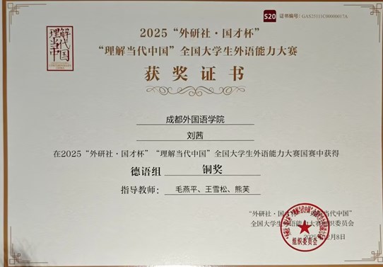 多语种组全国总决赛包括汉外口译、即兴演讲和回答问题两个环节。我校参赛选手凭借流利的外语表达、开阔的思想视野以及沉稳自信的现场表现讲述中国主张、中国智慧、中国方案,以青春之“小我”融入强国之“大我”,展现了新时代青年的外语能力与责任担当,彰显了学校在小语种人才培养方面的扎实成果,是我校坚持“以赛促学、以赛促教”的生动缩影。我院刘茜同学从校赛中脱颖而出,通过省级选拔,最终代表我省晋级国赛。在比赛中,她通过口译、主题演讲、即兴问答等多个环节,展现了对当代中国发展道路、理论体系与文化价值的深刻理解,以及用德语讲好中国故事的跨文化传播能力。备赛期间,指导教师为刘茜同学提供了系统性的辅导,从语言表达和内容逻辑等方面均进行了细致打磨。