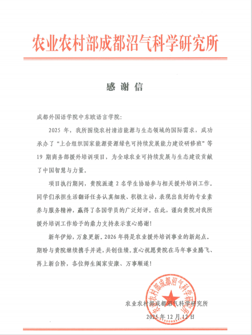 12月12日,农业农村部成都沼气科学研究所专门向我校发来感谢信,对我校精心选派师生志愿者所表现出的专业素养与辛勤付出表示衷心感谢,信中指出课堂教学翻译与生活翻译工作均获得了参训学员的一致好评。