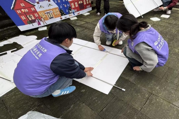 图为我院志愿者在活动前进行场地布置与物资准备