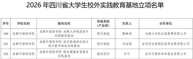 4月7日,四川省教育厅公示2026年省级大学生校外实践教育基地立项名单,我校共有3个项目成功入选,其中我院俄语教师甄静茹牵头申报的“成都大洋物流校外实践教育基地”项目成功获批,为俄语专业实践教学与行业融合发展搭建了全新平台。