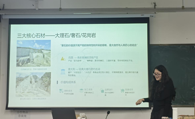 4月2日,渝华石业销售经理陈媛媛老师以“石材行业概况与基础知识”为主题,为同学们系统梳理了石材行业的发展现状、市场格局及常见石材品类。陈老师结合自身丰富的销售经验,通过大量实际案例,生动讲解了石材的物理特性、应用场景及国际贸易中的注意事项,帮助同学们建立起对石材行业的整体认知。